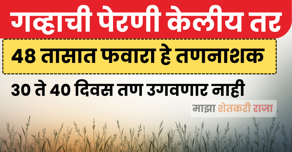 गहू पेरणीनंतर ४८ तासांत तणनाशक फवारणी करणे हे गहू पिकातील सर्वात महत्त्वाचे तंत्र आहे. प्री इमर्जन्स तणनाशके जमिनीत थर तयार करून तणांची उगवण थांबवतात. योग्य वेळ, डोस आणि पद्धत अवलंबल्यास पिकाची वाढ सुरुवातीपासून मजबूत राहते आणि अंतिम उत्पादनात मोठी वाढ मिळते. तण नियंत्रणातील ही वेळेची अचूकता शेतकऱ्याच्या नफ्याचे प्रमुख कारण ठरतात